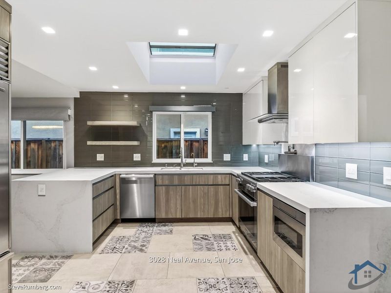 - Dishwasher, Freezer, Garbage Disposal, Hood Over Range, Microwave, Oven Range - Built-In, Gas, Pantry, Refrigerator, Skylight, Wine Refrigerator