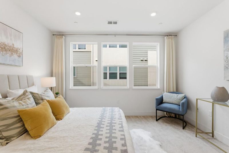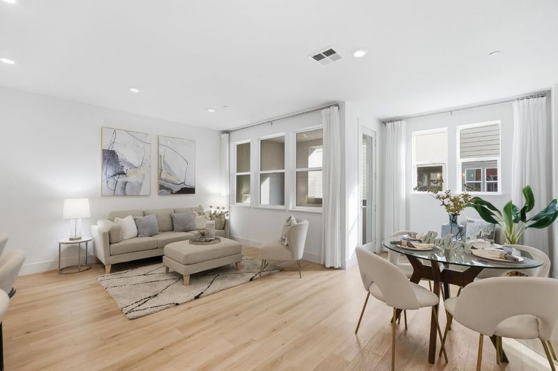 Beautifully upgraded modern home in the highly sought-after Nuevo community by award-winning Summerhill Homes with East-facing door. This light-filled residence features an open layout with high ceilings and hardwood floors connecting the spacious living and dining areas, plus a private balcony for easy indoor-outdoor living. The chef's kitchen offers quartz slab countertops, soft-close cabinetry, and stainless-steel appliances with ample counter space. Dual primary suites with en-suite baths provide flexible, private living options. Additional highlights include low Santa Clara utilities, efficient HVAC, a tankless water heater, a fully equipped 2-car garage fitness area, and a water softener. Enjoy community amenities including basketball courts, playground, herb garden, dog park, and bike station. Prime location near Nvidia and Apple, walking distance to Costco and Caltrain, with easy access to Downtown Sunnyvale, Santa Clara Square, Whole Foods, and major expressways.