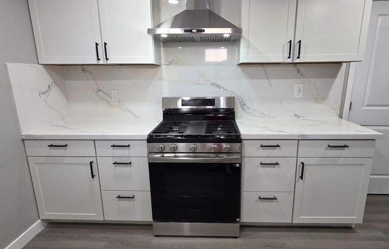 - Countertop - Quartz, Dishwasher, Garbage Disposal, Hood Over Range, Oven Range - Gas, Refrigerator